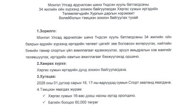Шинэ Үндсэн хууль батлагдсаны 34 жилийн ойд зориулан зохион байгуулсан сумын ИТХ-ын нэрэмжит “ВОЛЕЙБОЛ”-ийн шилжин явах цомын тэмцээн 2026 оны 01 дүгээр сарын 16, 17-ны өдрүүдэд амжилттай болж өндөрлөлөө.