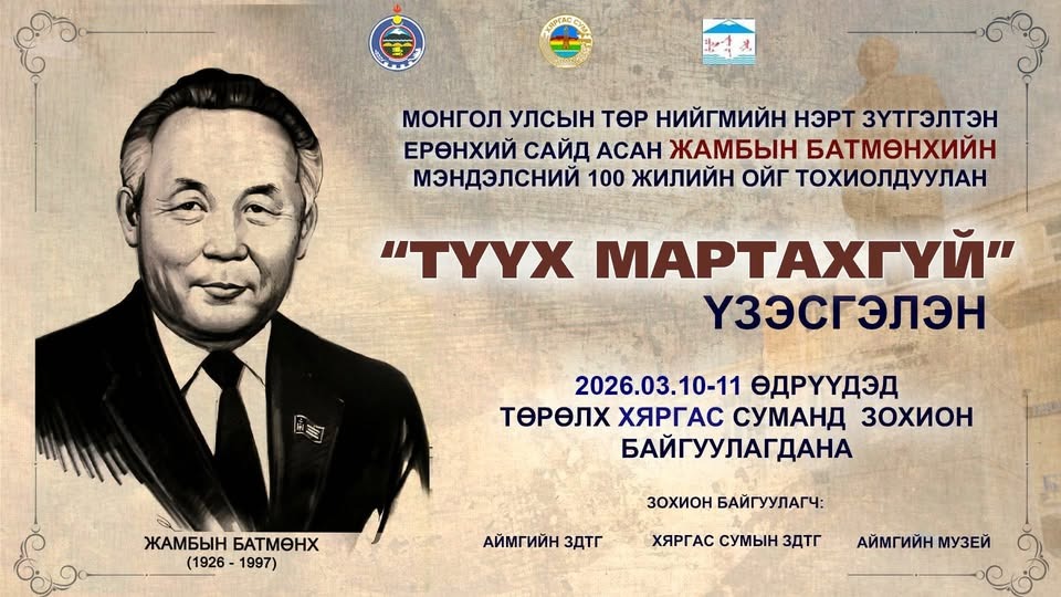МОНГОЛ УЛСЫН ТӨР НИЙГМИЙН НЭРТ ЗҮТГЭЛТЭН, ЕРӨНХИЙ САЙД АСАН ЖАМБЫН БАТМӨНХИЙН МЭНДЭЛСНИЙ 100 ЖИЛИЙН ОЙГ ТОХИОЛДУУЛАН “ТҮҮХ МАРТАХГҮЙ” ҮЗЭСГЭЛЭН 2026.03.10-11 ӨДРҮҮДЭД ТӨРӨЛХ ХЯРГАС СУМАНД ЗОХИОН БАЙГУУЛАГДАНА.