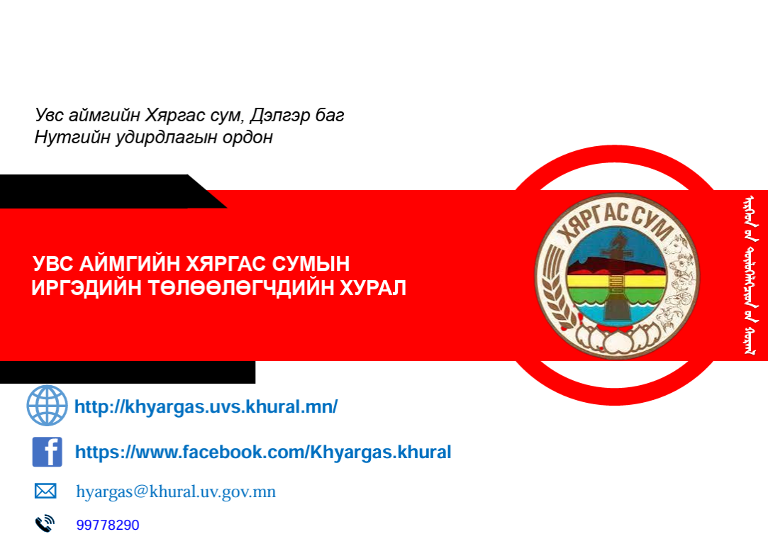 - Харьяалах нэгж: Хяргас сумын иргэдийн Төлөөлөгчдийн Хурлын Ажлын алба