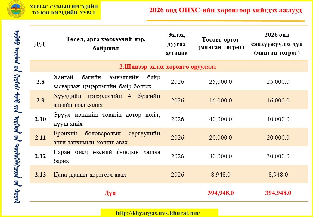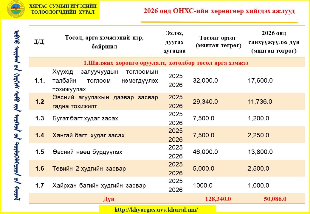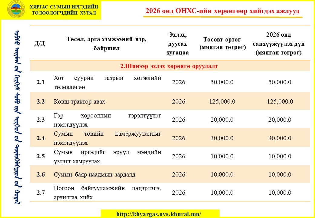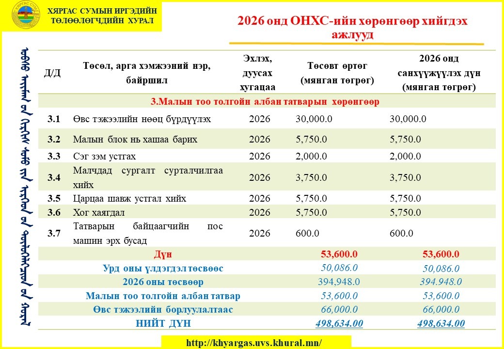 - Харьяалах нэгж: Хяргас сумын иргэдийн Төлөөлөгчдийн Хурлын Ажлын алба